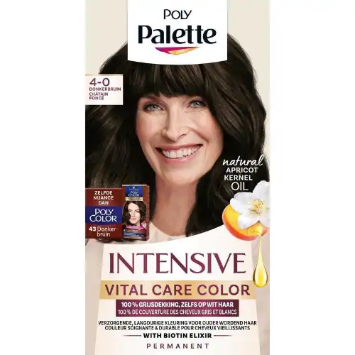 Transformeer uw look met een prachtige donkerbruine haarkleur vanuit het comfort van uw eigen huis. Schwarzkopf Poly Palette Vital Care Color 4-0 Donkerbruin is uw betrouwbare keuze voor een intense kleur en verzorging. Voeg nu toe aan uw online bestelling bij Drogist Solo!