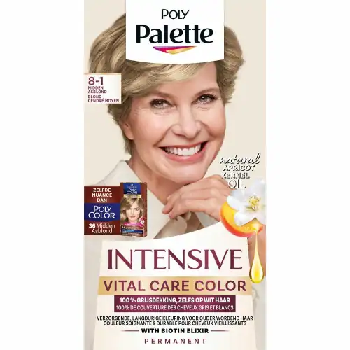 Met Schwarzkopf Poly Palette Vital Care Color 8-1 Midden Asblond kunt u eenvoudig vanuit huis een nieuwe look creëren. De midden asblonde tint is veelzijdig en kan bij diverse huidtinten passen. Ontdek de transformatie met deze populaire haarkleur.